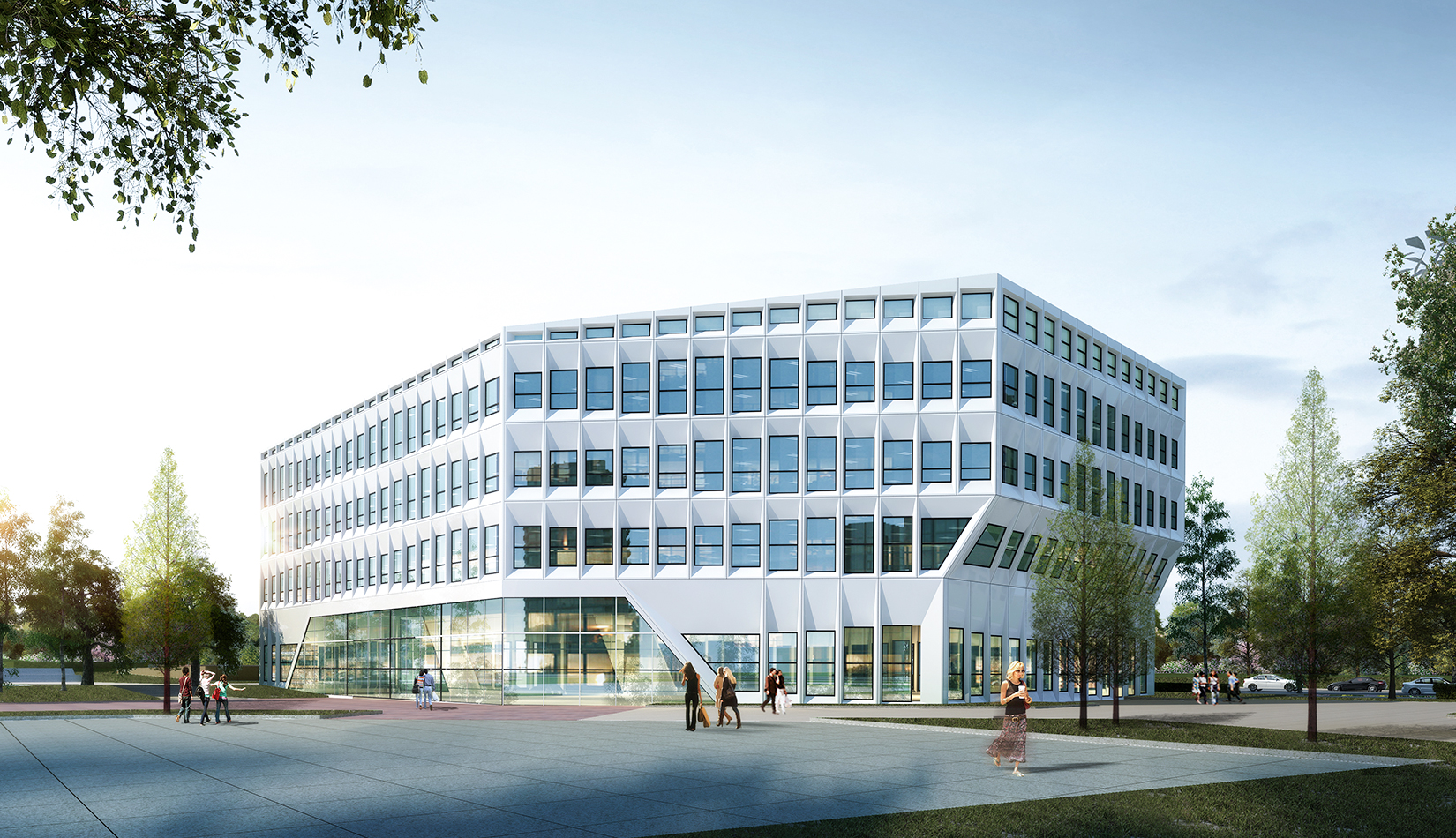 基地東望黃海海域,方案規(guī)劃運(yùn)用海浪形態(tài),曲折自由,同時(shí)變化豐富的立面設(shè)計(jì)手法呼應(yīng)海面的波光粼粼。海洋生物資源開(kāi)發(fā)中心金屬質(zhì)感的立面用如海浪般曲線變化的立面設(shè)計(jì)手法體現(xiàn)海洋建筑特色,以“海洋波浪”為入手點(diǎn),突破了科研平臺(tái)單一化的立面設(shè)計(jì)。