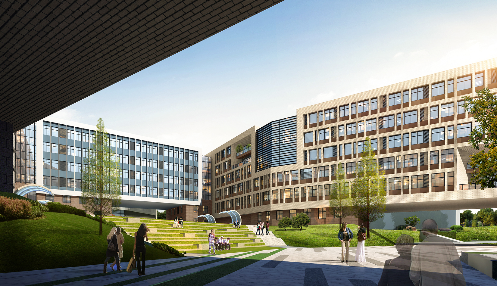 東區(qū)生活區(qū)庭院空間配合建筑設(shè)計(jì)的現(xiàn)代主義風(fēng)格,提取未來(lái)主義畫(huà)派的代表元素——線條 作為構(gòu)思的主脈絡(luò),以“理性與未來(lái)”為設(shè)計(jì)理念,在建筑圍合的景觀中庭采用現(xiàn)代景觀設(shè)計(jì),意在未來(lái),情致校園 。