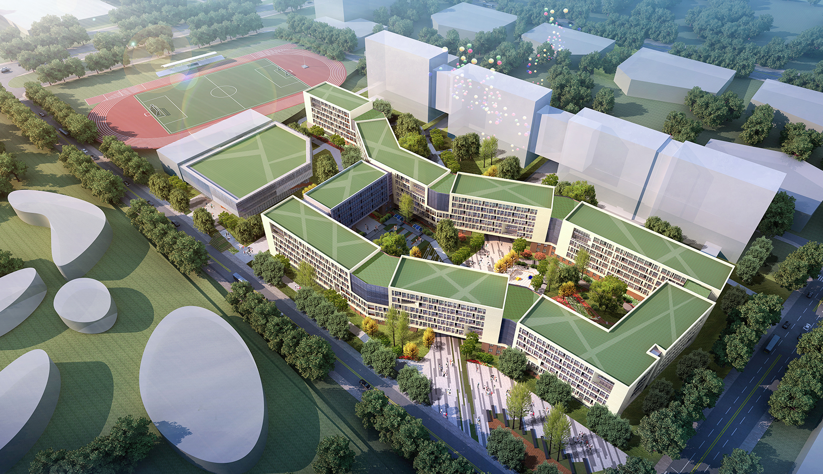 西區(qū)生活區(qū)順應(yīng)歐式建筑布局,采取 軸線景觀 設(shè)計(jì)手法,體現(xiàn)規(guī)整與有序的園林藝術(shù)特色。結(jié)合臺(tái)地景觀的設(shè)計(jì),營(yíng)造大氣的室外空間。庭院設(shè)計(jì)主要以規(guī)整式布局為主,另在主樓后部林區(qū)采用自然式布局,做到規(guī)整與自然式相結(jié)合,在山水之間為學(xué)生提供良好的學(xué)習(xí)環(huán)境。