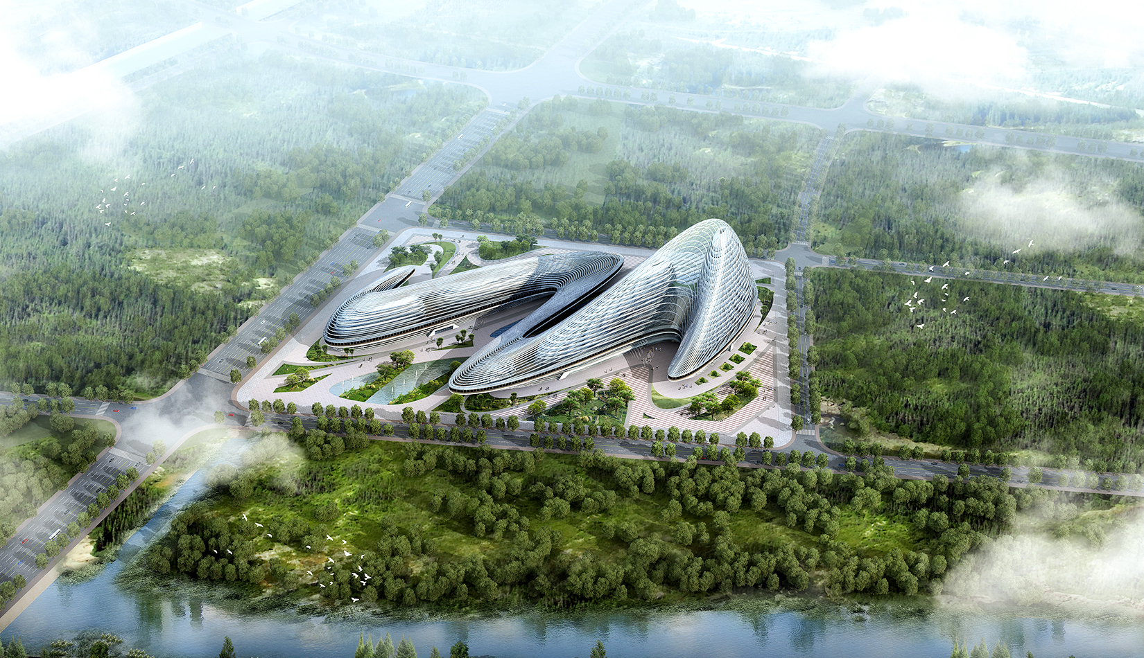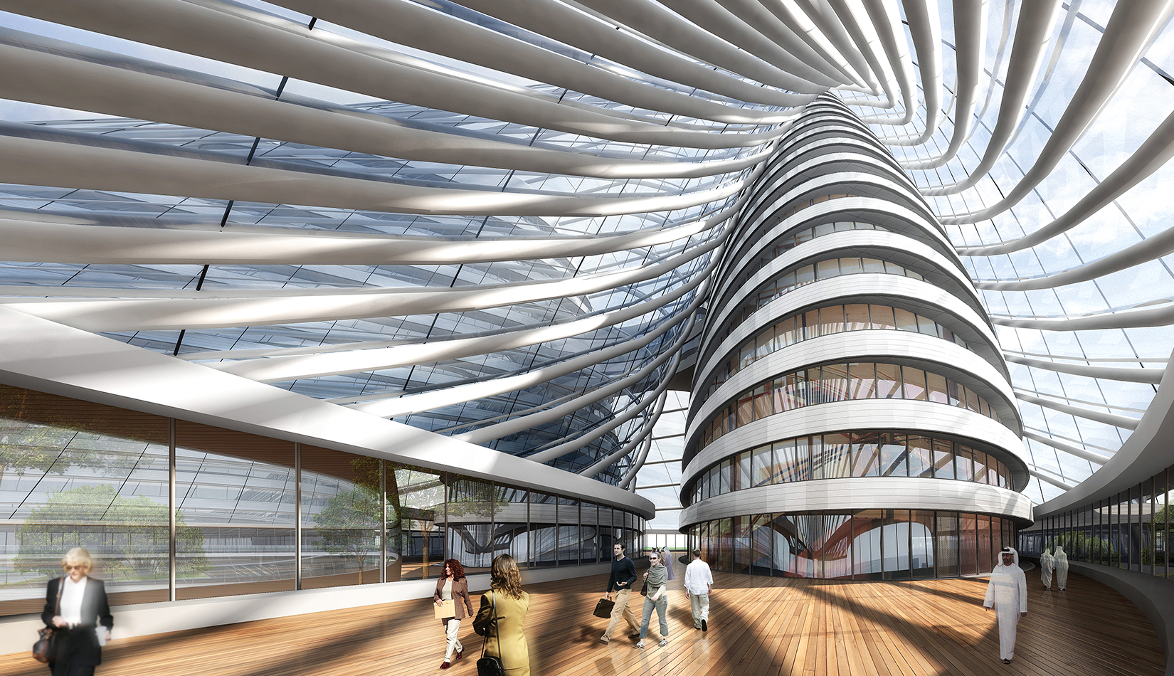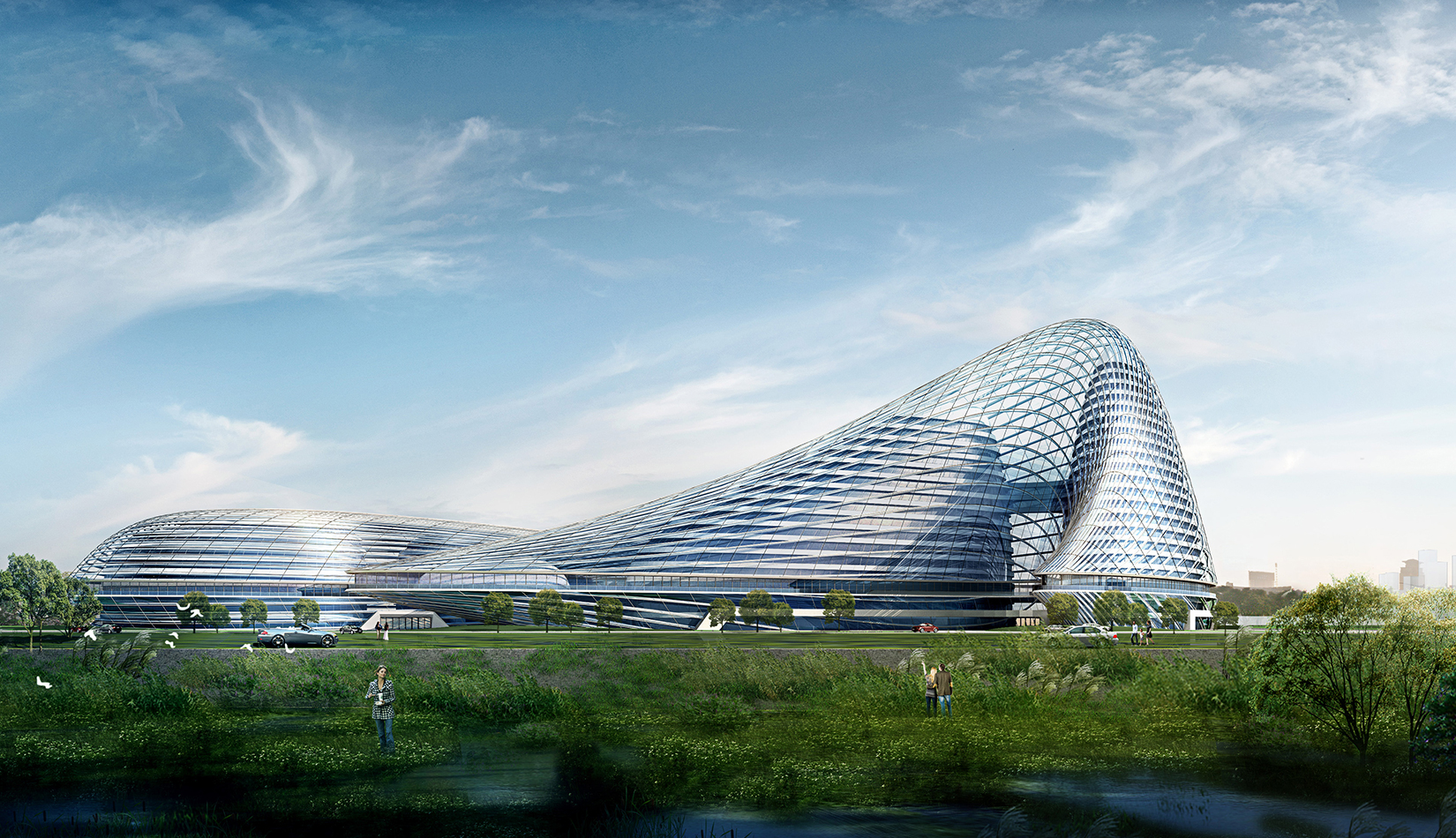 立面采用玻璃幕與智能金屬材料搭配,形成新型生態(tài)建筑。