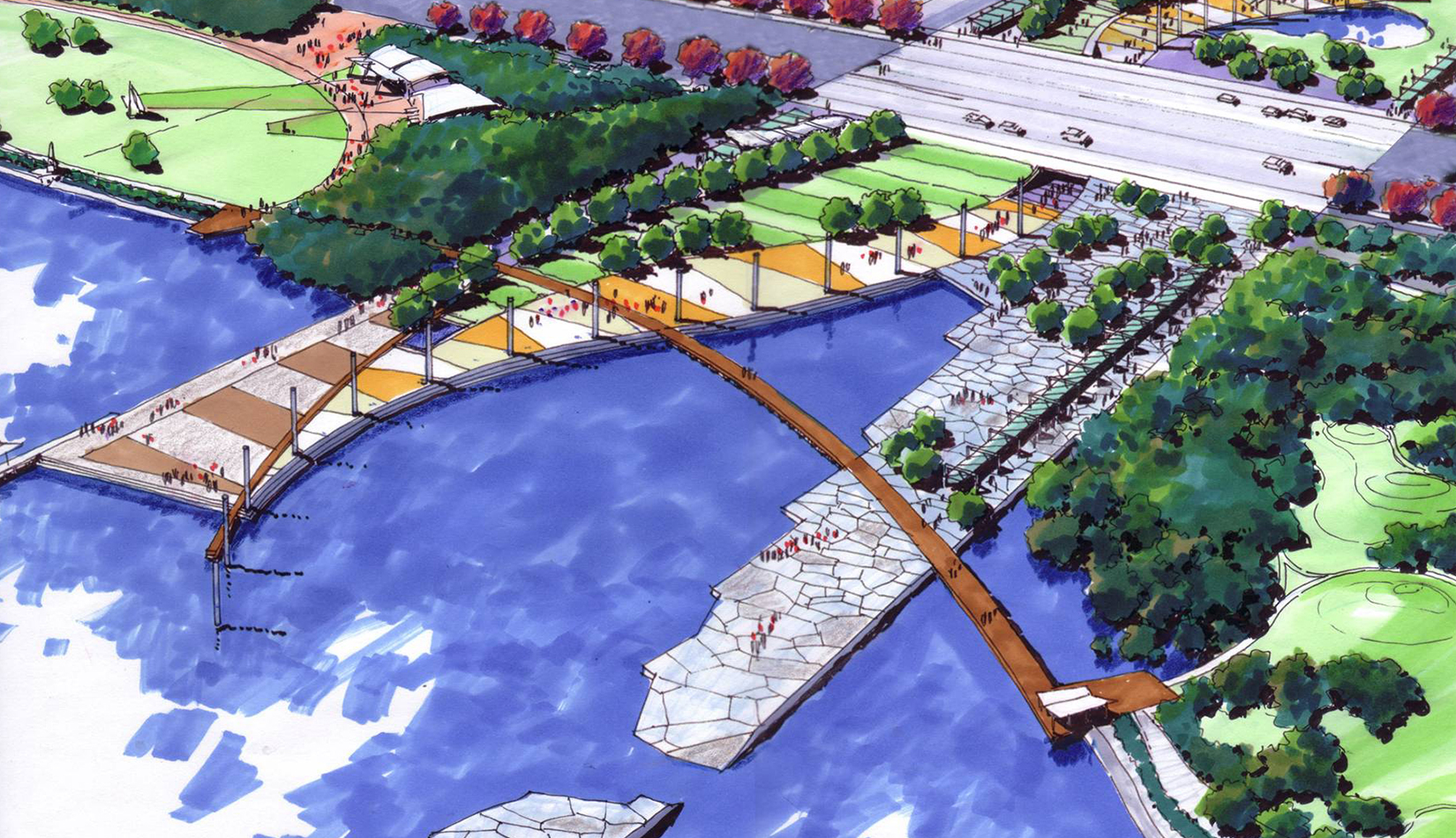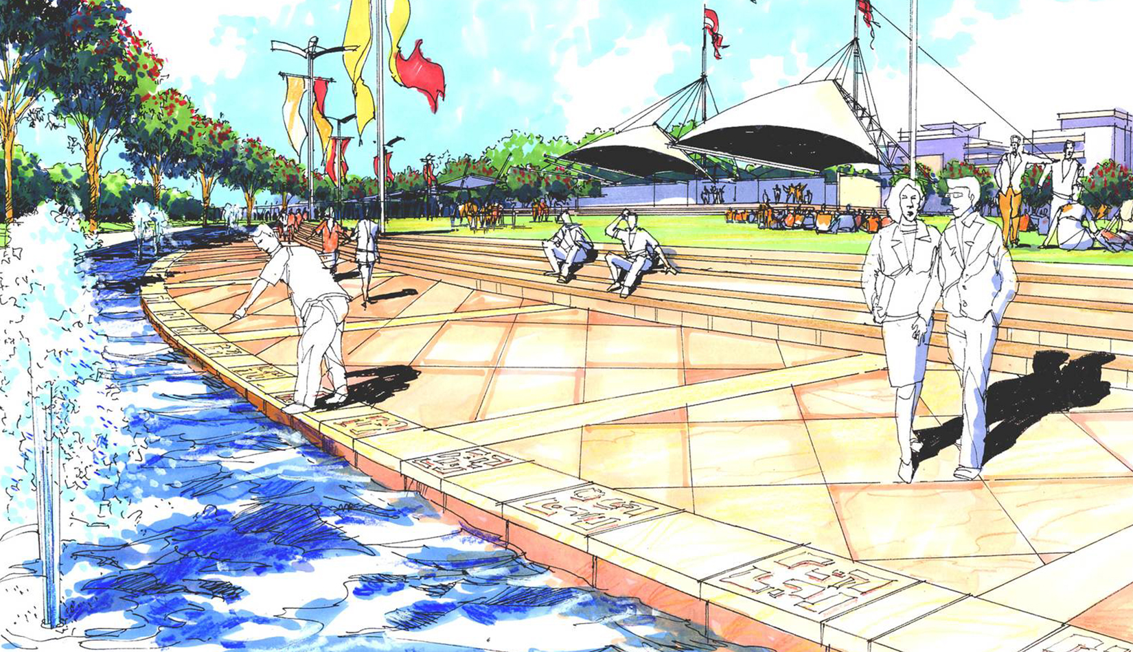 本著“文化著陸于自然”、“邊界突出聯(lián)系”的設(shè)計理念,規(guī)劃將灣島全線自西向東分為濱海運動休閑、親水廣場、公共藝術(shù)公園、人與自然公園和碼頭休閑娛樂5 個景區(qū),為基地北側(cè)的城市功能區(qū)乃至黃島區(qū)提供了一片高品質(zhì)的、現(xiàn)代濱海城市休閑景觀帶,增強(qiáng)區(qū)域的軟環(huán)境競實力。