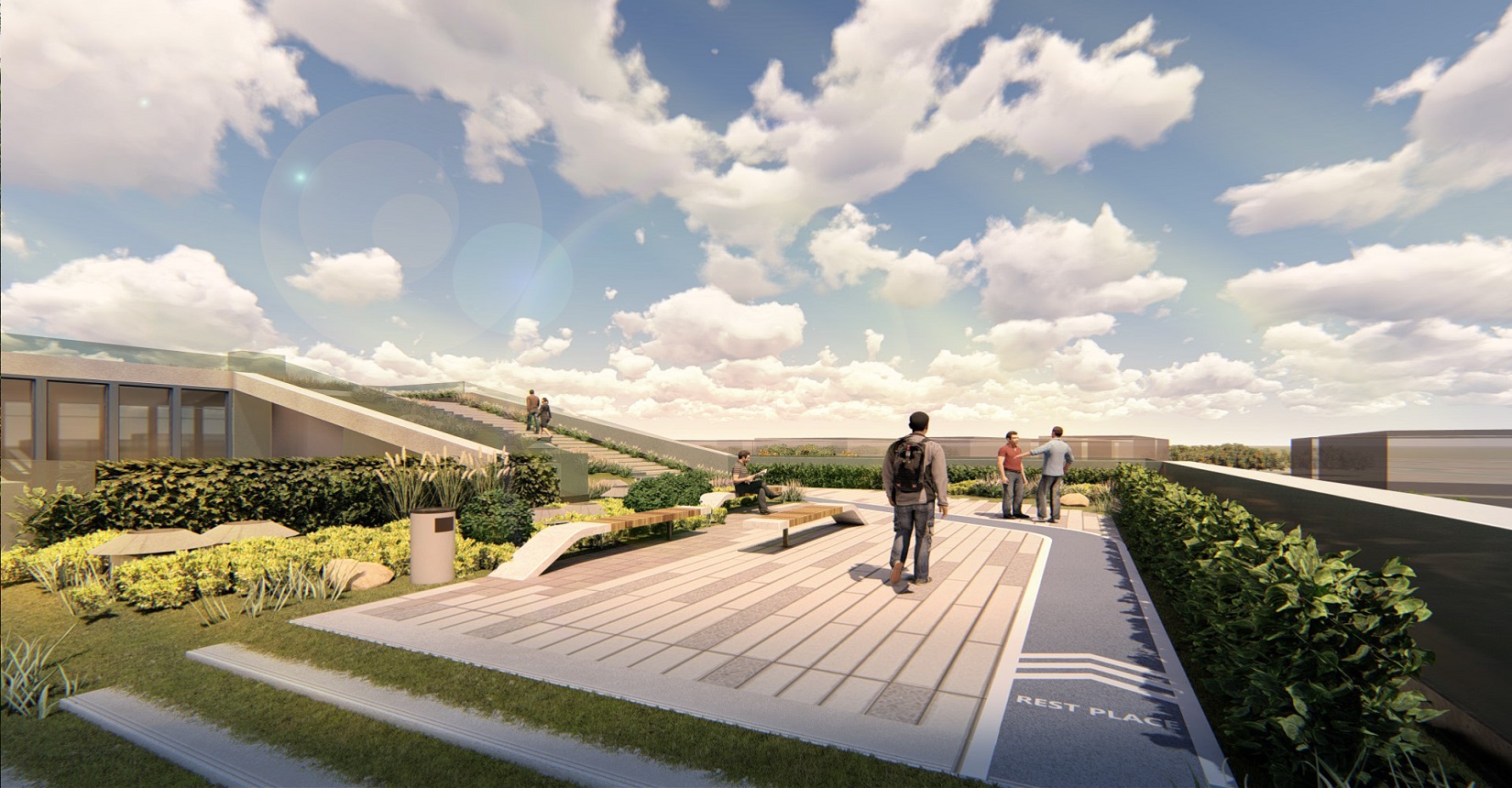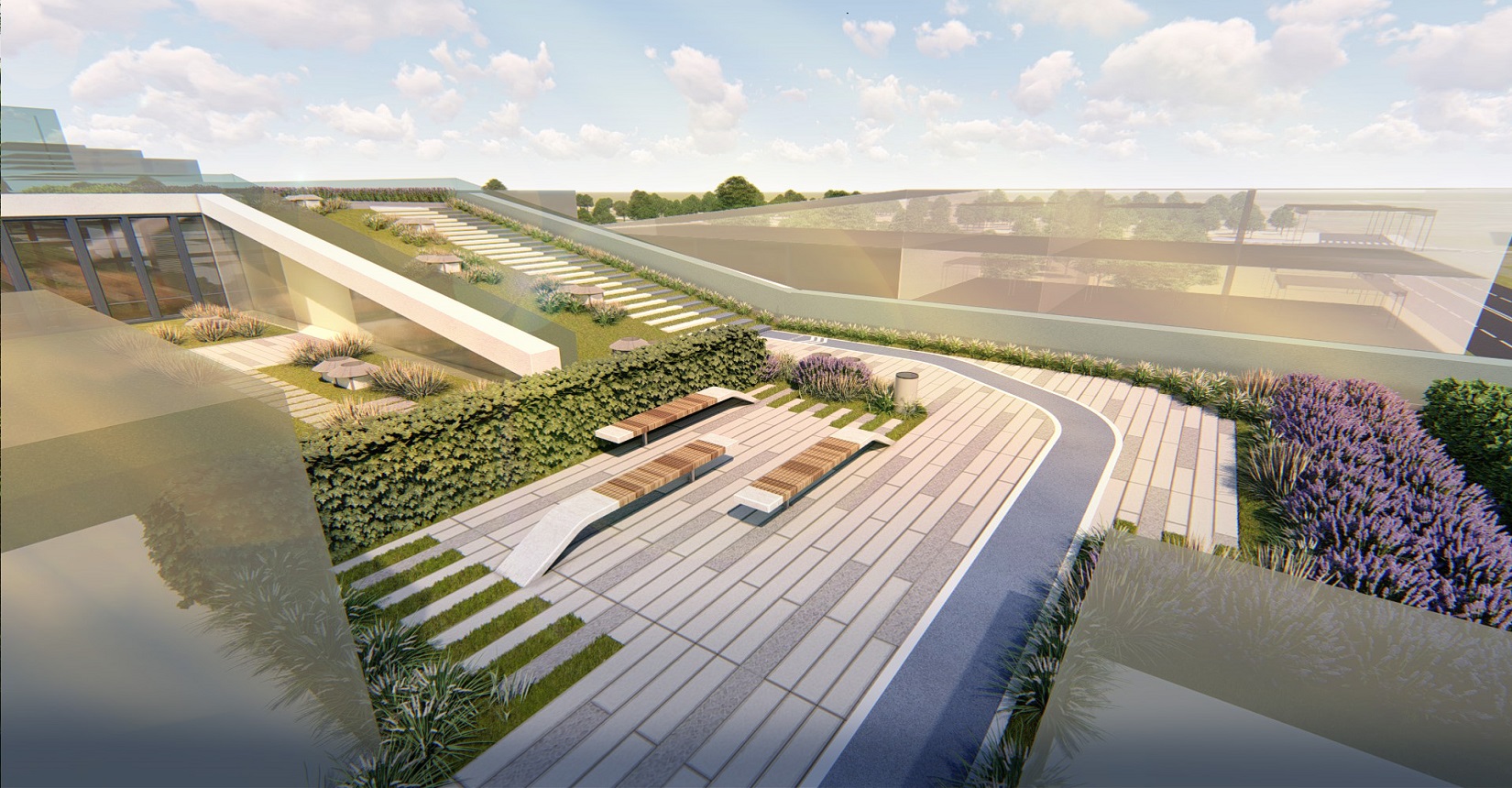 強(qiáng)調(diào)室內(nèi)空間和室外空間的融合,利用屋面打造慢行系統(tǒng),使建筑成為公園的組成部分,將公園景觀引入建筑當(dāng)中,打造具有標(biāo)志性的城市客廳、一個戶外生態(tài)客廳、原生態(tài)的生活空間,鼓勵面對面的交流,員工之間的交流,員工與客戶的交流,鄰里之間的交流。使用一條流動的能量線環(huán)形慢跑道,串聯(lián)整個空間傳達(dá)先進(jìn)、高能量與流動的整體形象。